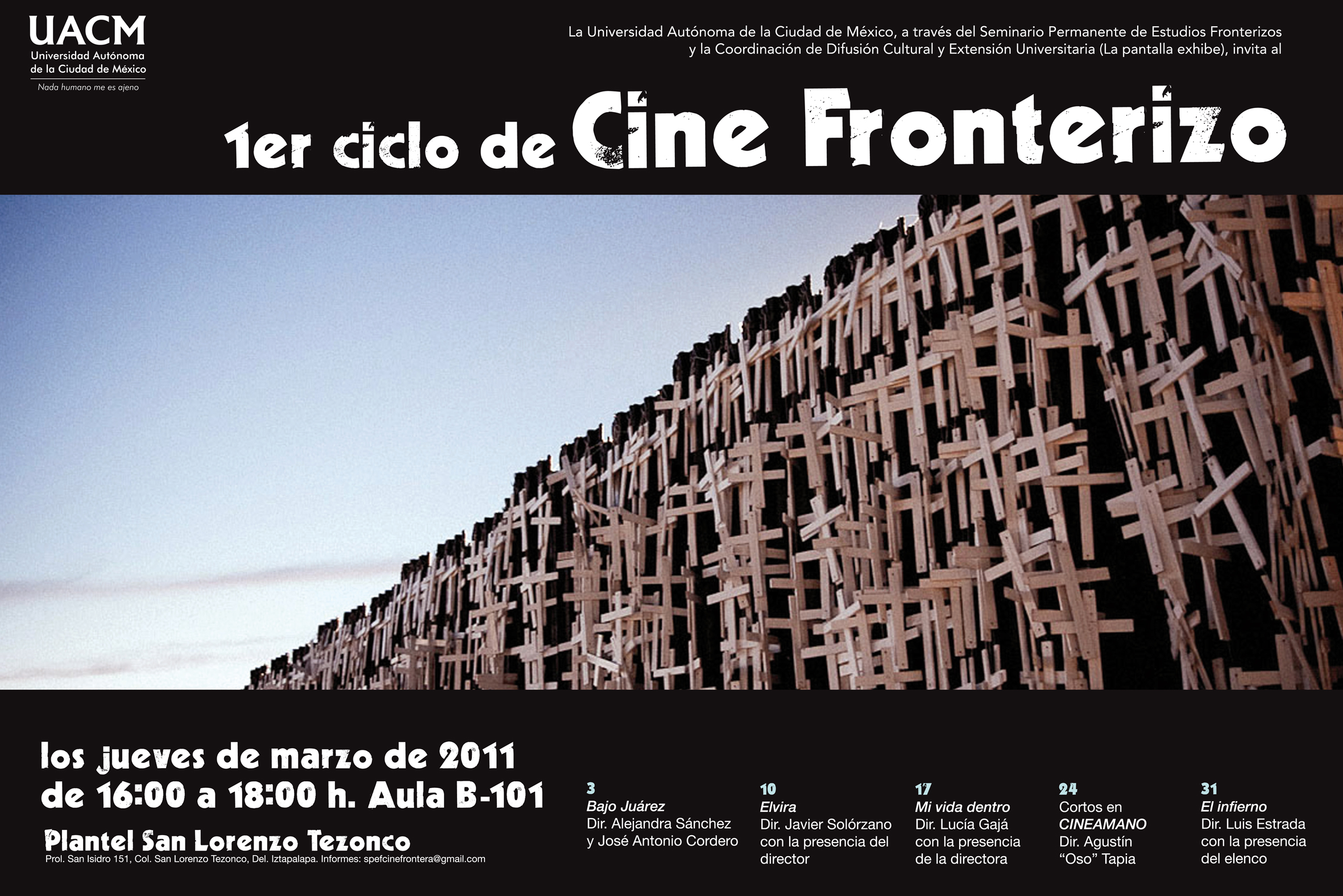 El Seminario Permanente de Estudios Fronterizos-UACM y Pantalla Exhibe, tienen el agrado de invitar a toda la comunidad universitaria al Primer Ciclo de Cine Fronterizo que se realizará en la Universidad Autónoma de la Ciudad de México (UACM), sede San Lorenzo Tezonco, en el mes de marzo del 2011 durante los jueves de 16:00 a 18:00 hs. Este evento surge como una propuesta del Seminario Permanente de Estudios Fronterizos (SPEF) y tiene como objetivo completar el análisis de los estudios de la frontera para tener presente que esta forma de vida es parte de nuestro contexto histórico y que se puede abordar desde la teoría filosófica, política, social, antropológica, etc. o desde la expresión cinematográfica para su comprensión y goce estético.